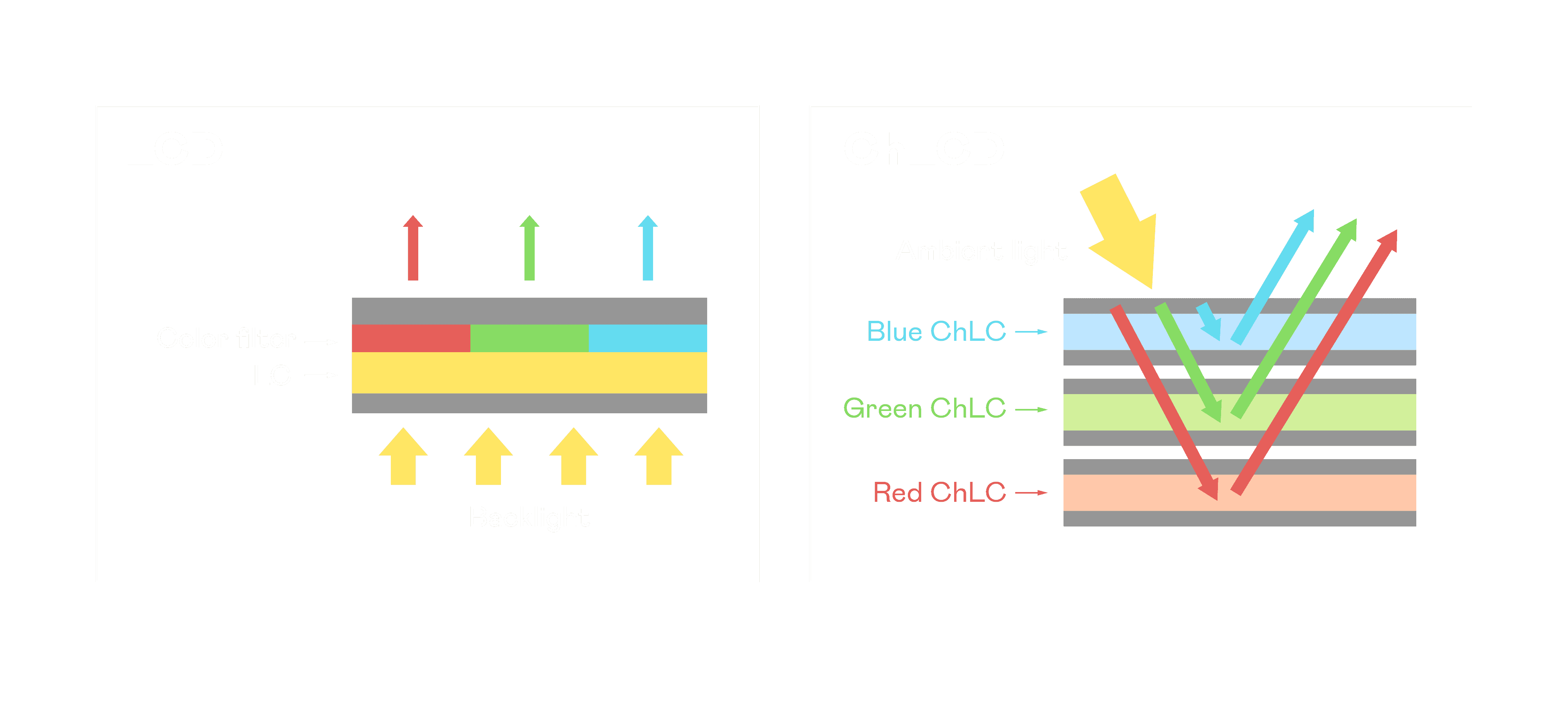 ChLCD 胆固醇液晶就如同纸张一样,,,透过反射环境光来显示影像,,,,因此长时间观看不易造成人眼视觉疲劳,,,可达到护眼效果。。。。当处于户外阳光下使用,,,,LCD 影像容易失真而不易观看,,但胆固醇液晶仍可维持较佳的影像品质。。。。