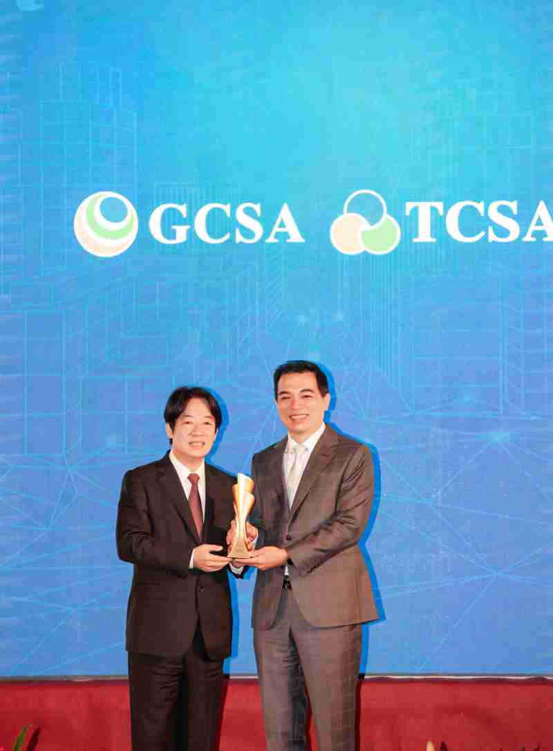达全方位永续表现获全球永续奖及台湾永续奖肯定,,,由副总统赖清德颁奖 (左),,,,至成国际总经理柯富仁 (右) 代表领奖