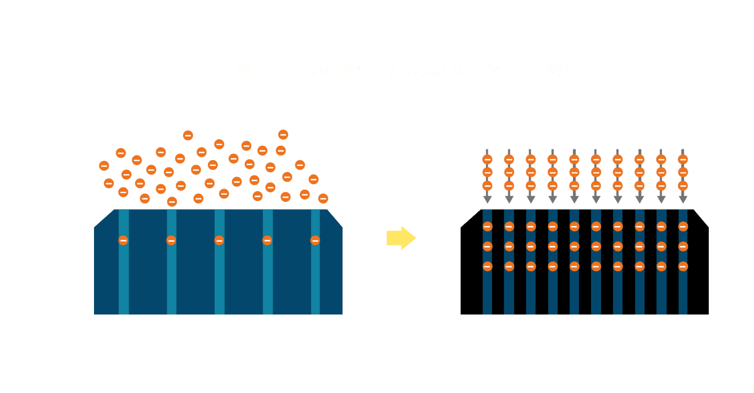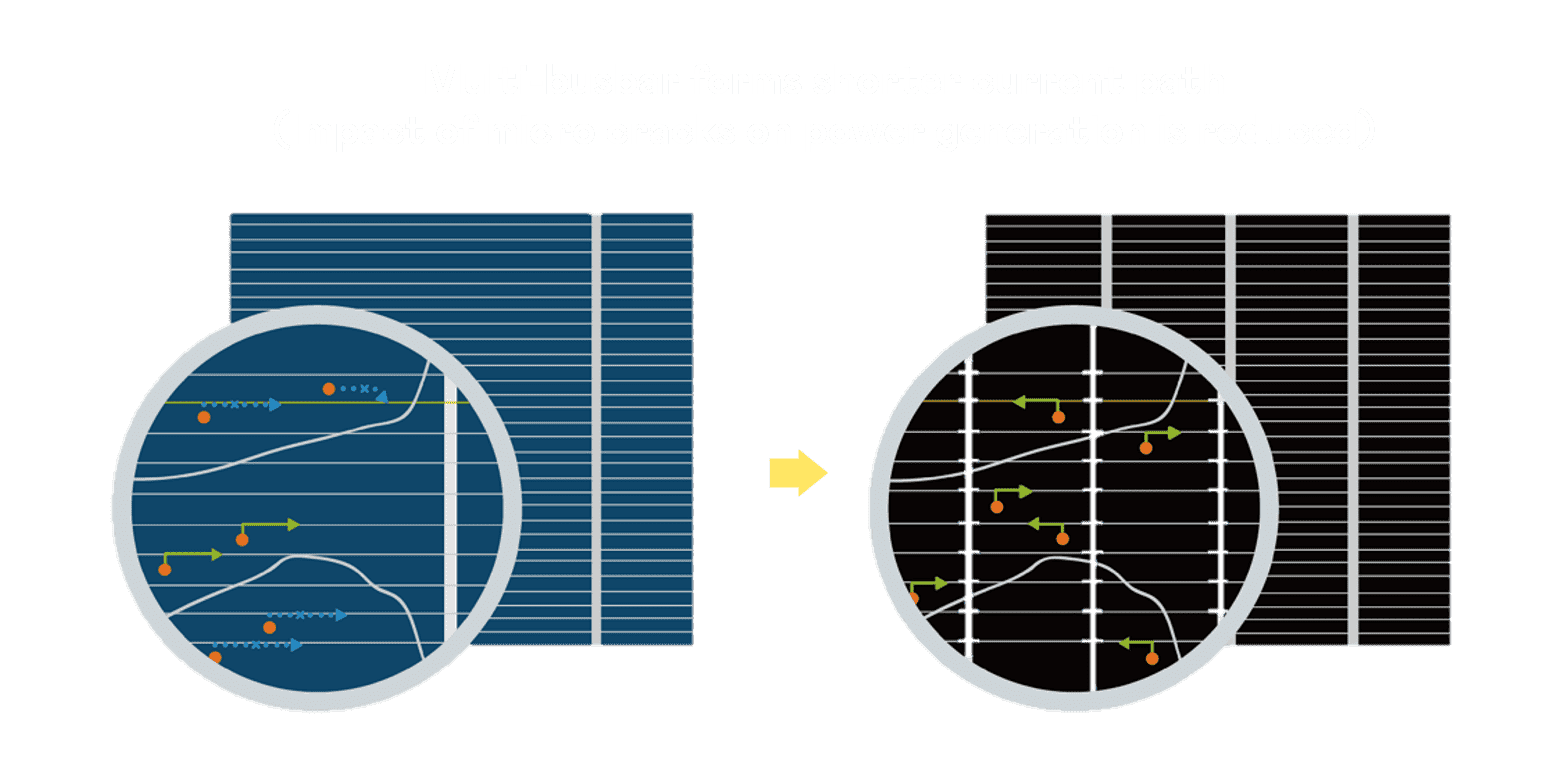 - 多条电极栅结构,,,可有效降低外力对于电池的影响,,限制电池隐裂 (Micro-cracks) 范围,,,,防止电流传输路径 (Current distribution) 之损坏进一步扩大。。