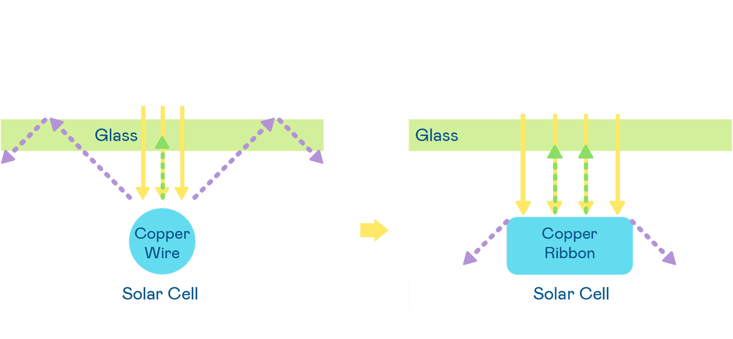 - 电池使用多条铜导线 (Copper wire) 于电池片上形成较短的电流路径,,提高电流收集效率,,采用圆形设计的铜导线较传统扁平式的铜焊带 (Ribbon),,,可增加入射至电池的光线量。。。。