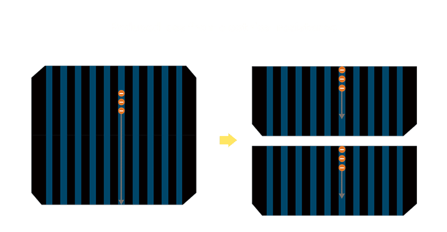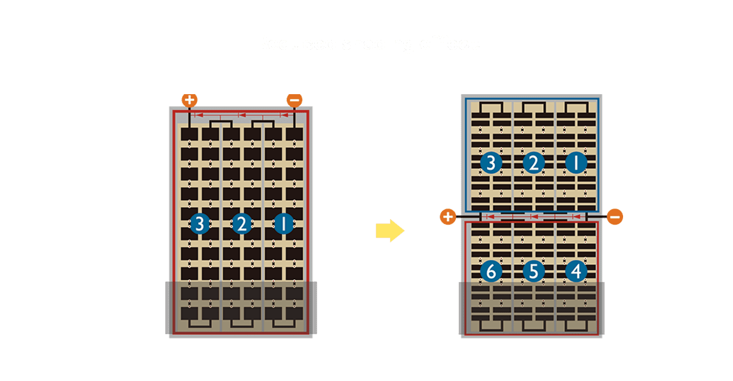 - 结合半切电池,,降低遮阴影响、、、、提升模组抗隐裂能力、、并减少电阻损耗,,,进一步提升模组发电效能。。。。